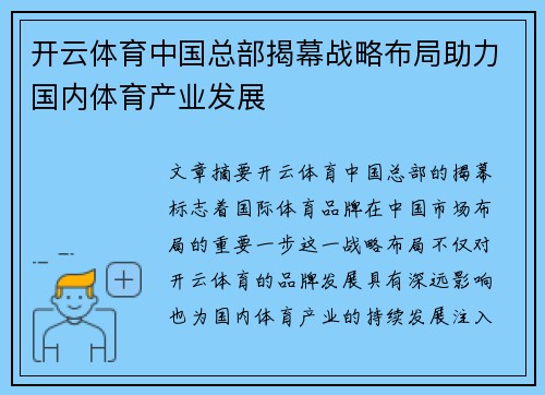 开云体育中国总部的揭幕,标志着国际体育品牌在中国市场布局的重要一步。这一战略布局不仅对开云体育的品牌发展具有深远影响,也为国内体育产业的持续发展注入了新的活力。通过开设中国总部,开云体育将在提升品牌知名度、推动本土化发展、促进产业合作和促进社会责任方面作出更大贡献。本文将从四个方面详细阐述开云体育中国总部的揭幕如何助力国内体育产业的发展,包括品牌推广与市场拓展、科技创新与产品研发、人才培养与职业发展、产业合作与社会责任等。通过分析这些因素,可以更加清晰地了解这一战略布局对中国体育产业带来的深远影响及其未来潜力。