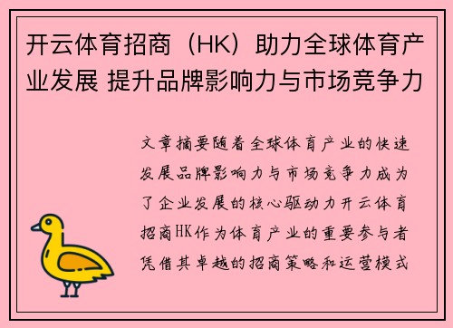 文章摘要:随着全球体育产业的不断发展和市场需求的变化,开云体育招商平台在台湾市场的发展潜力日益凸显。该平台通过多元化的合作模式,为台湾地区的投资者和合作伙伴提供了丰富的商业机会。本文将从四个方面详细探讨开云体育招商平台如何助力台湾市场的发展,包括市场环境分析、平台优势、合作模式、以及未来发展趋势等内容。通过这四个方面的详细分析,可以更全面地了解开云体育招商平台在台湾市场的战略布局与实际操作,以及为台湾市场带来的积极影响。最终,本文将总结开云体育招商平台的作用和未来前景,展现其在台湾市场中的独特价值。