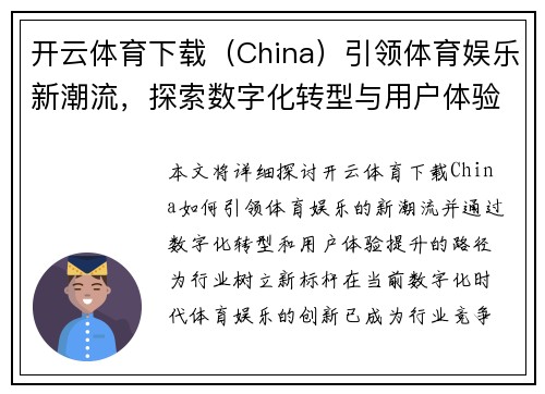 本文将为大家带来关于开云体育下载大陆版最新应用下载指南及使用教程的详细解析。随着体育赛事的逐步增多,越来越多的用户选择通过开云体育平台观看和参与体育活动。开云体育的大陆版应用因其强大的功能和丰富的内容,成为许多体育迷的首选。然而,如何下载、安装并有效使用这一应用,仍然是许多新用户面临的难题。本文将从四个方面详细解析开云体育下载大陆版的相关指南与使用教程,帮助用户顺利体验这一平台。内容涵盖应用的下载安装过程、应用界面和功能介绍、常见问题及解决方法以及如何提高使用体验,旨在为广大体育爱好者提供全面的参考。