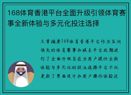 168体育香港平台全面升级引领体育赛事全新体验与多元化投注选择